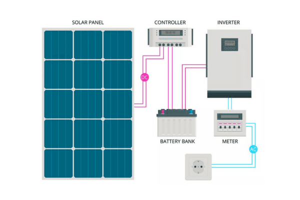 Battery (or battery bank) — stores DC energy. Commonly used chemistries include lithium-ion (most popular), lead-acid (older/cheaper), and newer flow or solid-state types emerging.